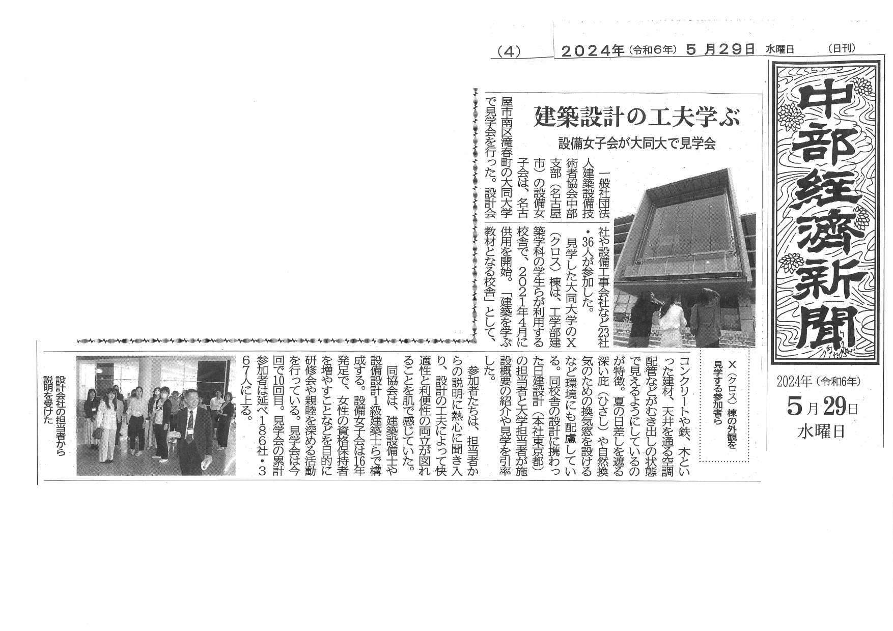 【中部支部(見学会)】2024年5月24日『大同大学X棟(クロス棟)見学会』(中部経済新聞)